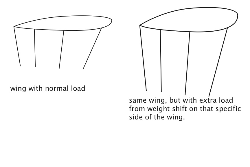 Simon, I believe that your conclusion is inaccurate :? . The weight shifting does not "alter the profile" (airfoil cross section geometry), but the overall airfoil symmetry. Weight shift actually does two things at the same time - it shifts the center of gravity and creates "imbalance" in resulting lift vector of an airfoil (parallelogram anyone?). I think you can conclude in which way my illustration will start to turn :wink:.