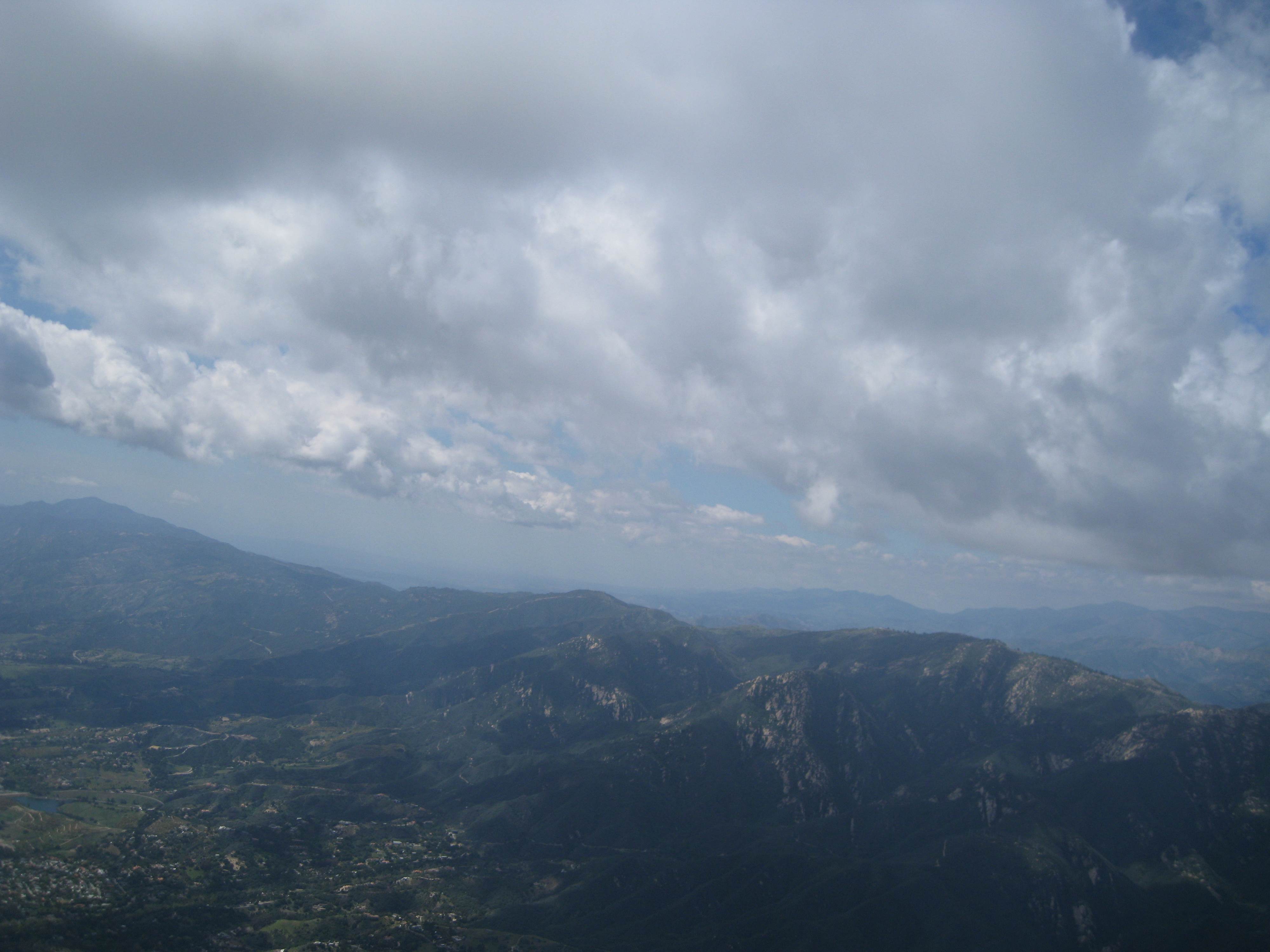 Nice conditions this afternoon today at Eliminator. As the north winds backed off the peak, the cycles were coming in lightly. No down drafts as clouds developed and pushed out overhead. Launched at 2:03. Found lift over Round House and Antenas to 3500'...pushed out to Lower Parma and worked good convergence lift to 4600' over Sycamore Canyon and Eucalyputus Hill...Turned down coast, dolphined with a 10 mph tail wind and made the bluffs at Bates with 750'...where it was light SE, E on the beach. Some edginess in the mtns, but not bad though, 1100 up and 1400 down. Many thanks to Marge for pictures and chase !!!