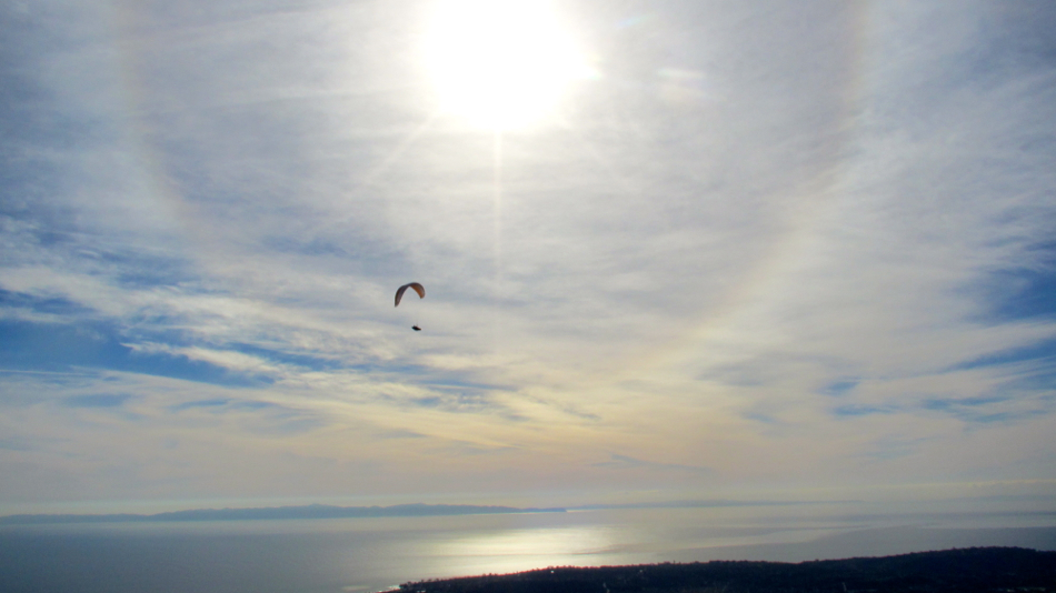 9 headed up in the Partyvan(trademark!) to scout the Back of the Rack hg launch and a nearby knob for some high ridge soaring. Willie flew his hg down to Parma but we weren’t sold on launching- it was clocking high teen SE gusts. We checked Ejs next but again, too windy. At sky port it was weak in and we decided to ‘huck for luck’ on a shortest day/shortest flight challenge ;) Surprisingly, most were able to hang @ the antenna farm for as long as we liked- up @ 25+ in smoothies with room to fly around. Michelle and I took a nice glide seam out to E Beach from @2750. I think we had one St. Mary’s landing… Aaron and Kev (et.al) landed Parma to run retrieves- thanx. fun under the scuds.