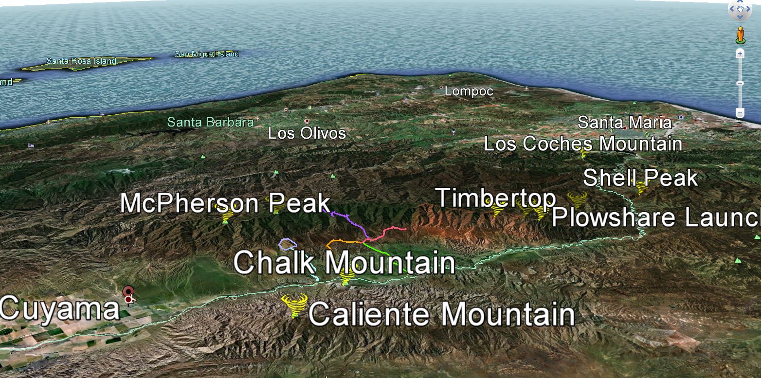Andy, in case bob cant get back to you, its about 20-25 miles from plowshare launch depending on where you land in cuyama/new cuyama. I attached a google earth pic below of the area. it seems to take an odd special day to get past cuyama as you hit stiffer north east winds from bakersfield and south east wind from the draw behind pine up the 33 river bed.