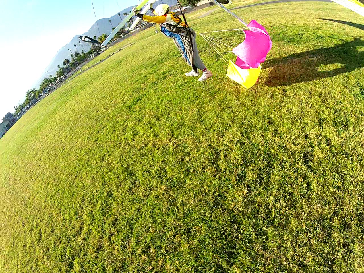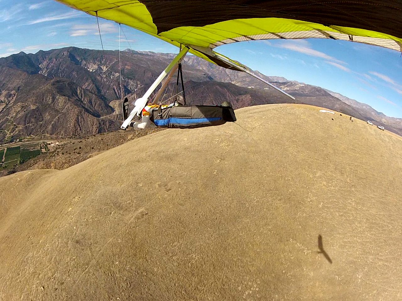 Me Sundowner & Nitrous. Visited with Ronnie down in the canyon while waiting for the high clouds to clear out and the gusty SE winds to back off. I think sd first hucked off around 12:20-ish and got flushed, landing down on the spine. Nitrous went to pick him up while I prepared my T2C for launch. I hucked off next around 12:35-ish.