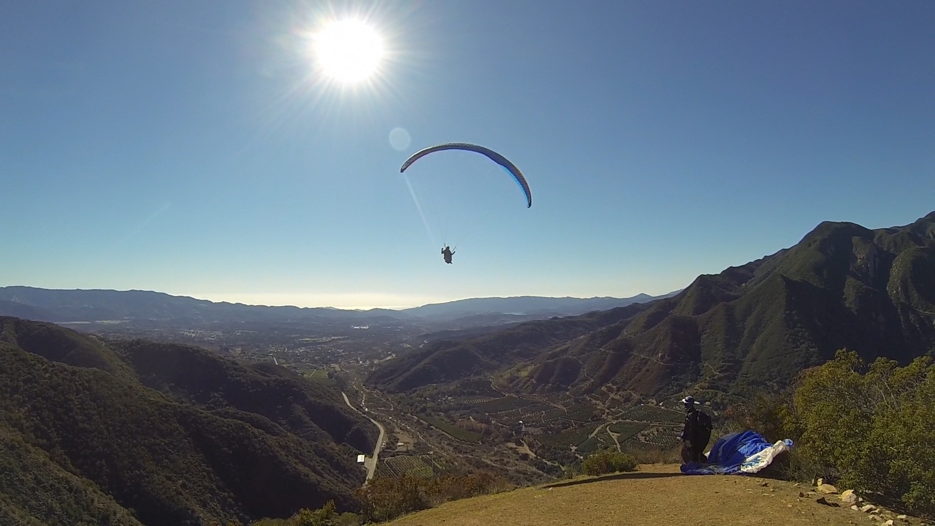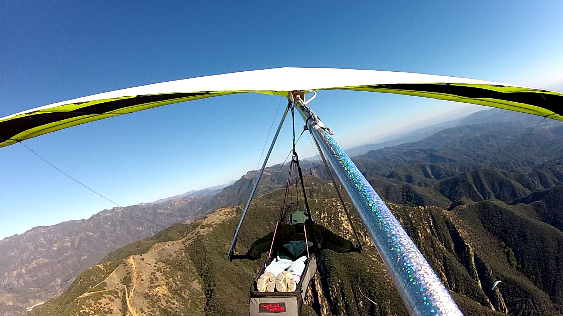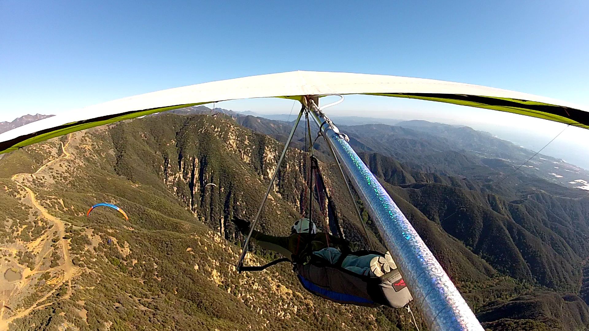 What can I say but a GREAT start to the New Year with 6 of us launching the Nuthouse in Ojai and all making it over the pass to SB (5 landed Elings and Ron landed E Beach). Beautiful hike in the cool weather to launch. It was my first time launching there. It's a smallish but immaculately clean launch site. Handtools are kept up there for continued maintenance and SD got to it as soon as he was on launch. I brought a go pro but unfortunately forgot the mounting clamp so I didn't take much in the way of in air footage. Tim, Aaron and I got stuck low over the peak of Whiteldge for a little bit and I really wish I had the camera going then while the 3 of us circled together closely hoping for a climb that would let us chase down SD on his westbound leg. Got a great climb over 4000' at the RR that made for an easy glide to Elings to join the party. As soon as we can do another flight from Nuthouse westbound I'm in!