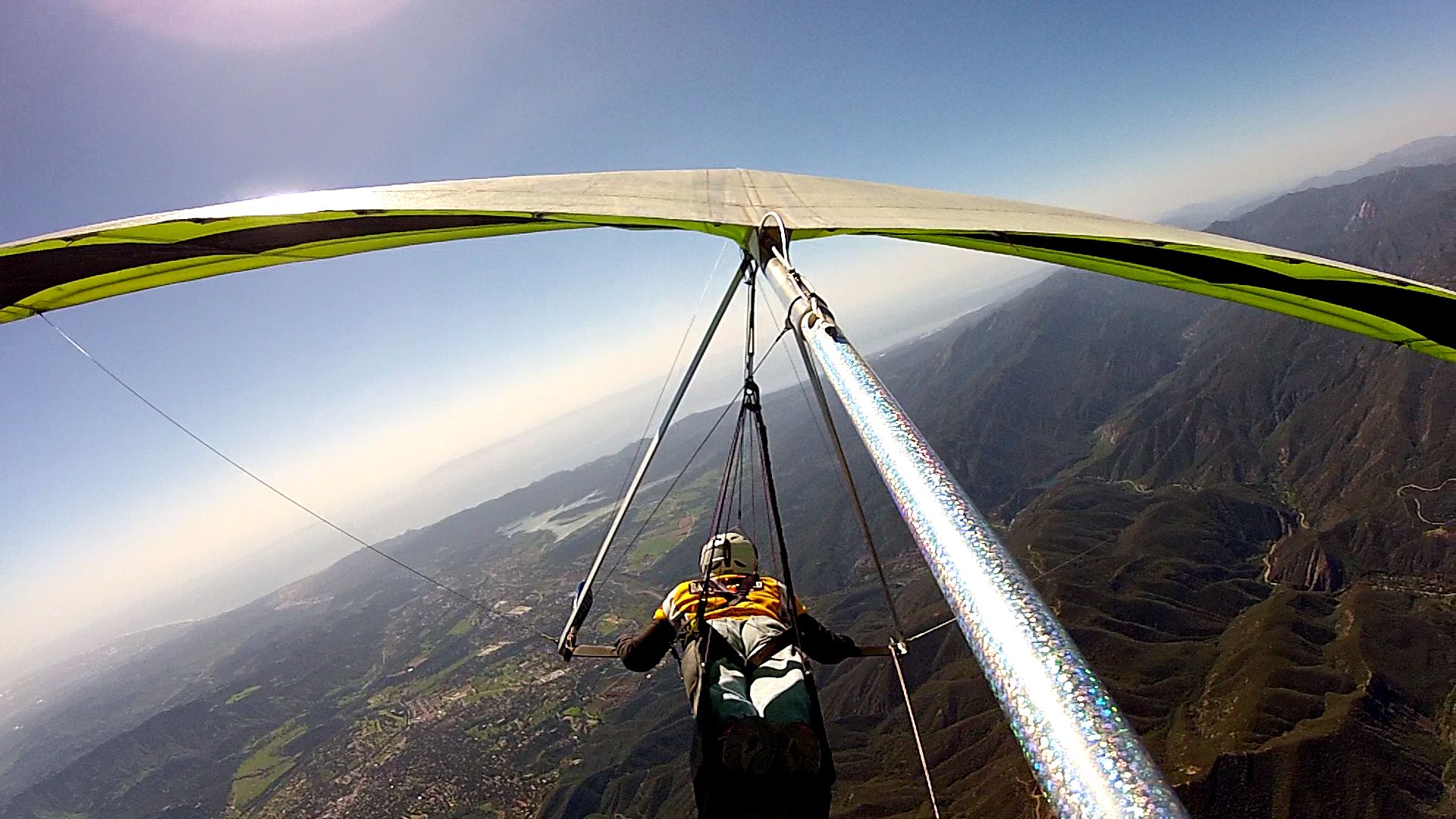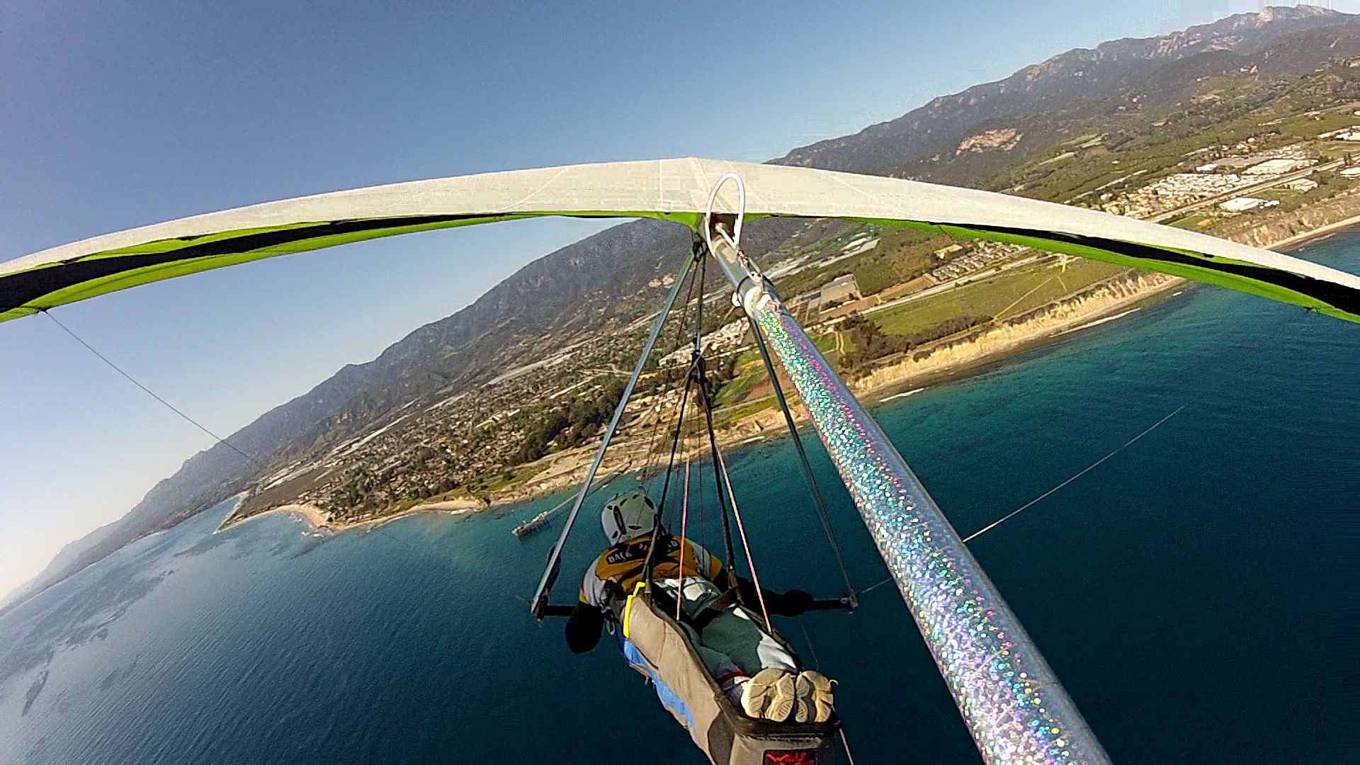 I launched just after Aaron's first launch at about 10:45/11:00 from EJ bowl. I quickly hung a right and went out to the VOR. Aaron and I had high hopes of continuing that leg. But after I tried for Painted Cave and got drilled, we turned around. It was a super fun flight going down wind. Lift was strong and smooth, until the edge was found, then it got exciting. Climbed from the Eucalyptus on the West side of Montecito to 4500 in about 5 turns. It was cranking!!!