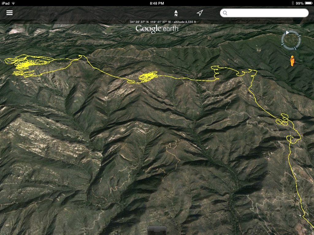 I hung around in the middle and it turned on a little better and I got enough to press Eastward. Hammer caught up to me around the powerlines but his radio wasn't working. It unlocked after he launched and went off channel. We parted ways before he reached West Divide where I looked back to see him later climbing to 7400+. That's where he later reported turning back and gliding all the way to launch without ever making a single turn. I hit 8K at Whiteledge and proceed across the pass.