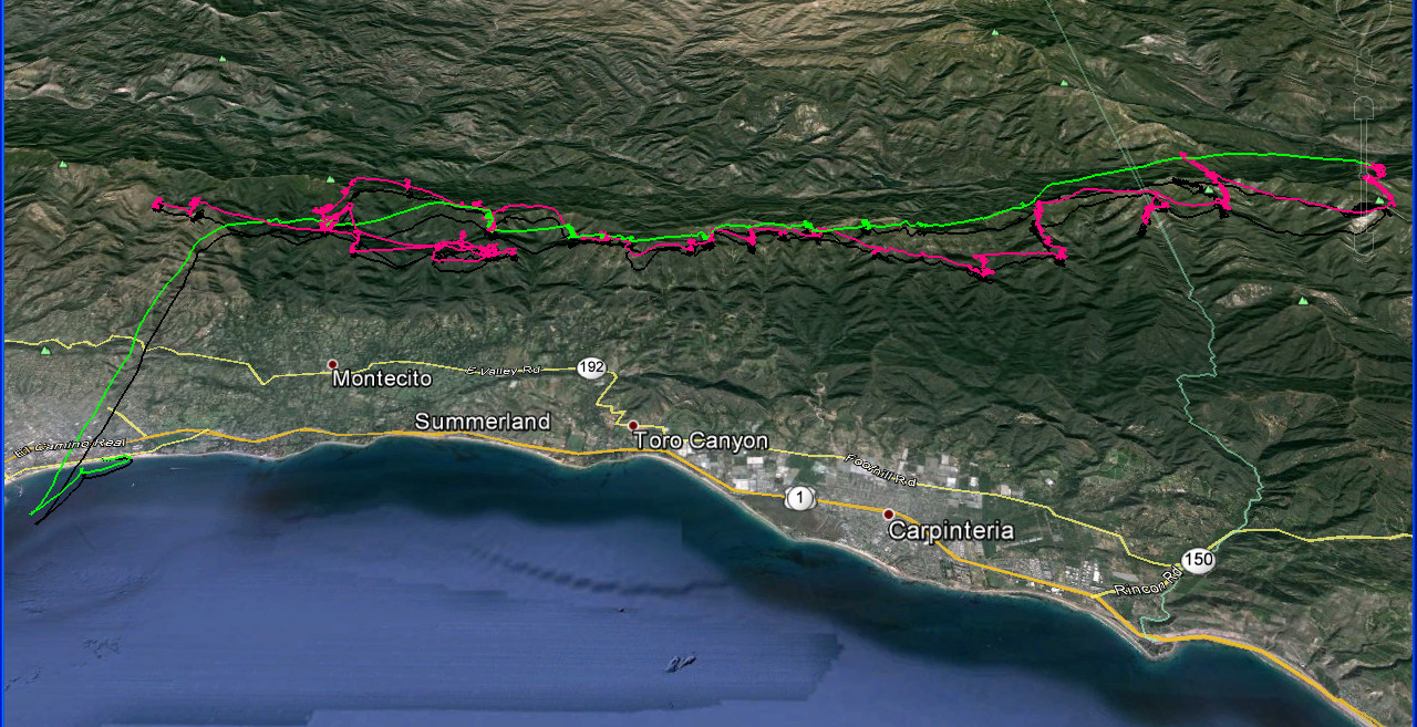 Tavis and Matt got down near the powerlines where Matt was reporting a 27kph headwind. They then glided out to Padaro to enjoy warm beach and ocean swimming in their boxers soon to be joined by Willie and Max. Hammer kindly offered to land at the beach and retrieve. Retirement really suits this gentleman! But I've jumped a bit forward.