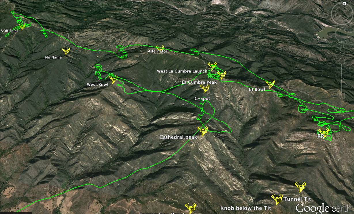Drove up from T, to VOR at 10ish with: Chris G, Kristen, Dave B., Matt, Chad and couple others. Thermals nice enough to launch but not enough to get swept up vertically out from your shoes like yesterday and Friday, so that was nice. Chad took the first swing and promptly disappeared over us... like 6 or more grand? Everyone else followed, I launched dead last, and (flight track) of course didn't catch anything, toolied down the spine and finally hooked in and easily (thank god, i don't need to flush already do I?) got up to go over No Name, then West Bowl, then join the rest of the fun in the fishbowl 'proper' :lol: