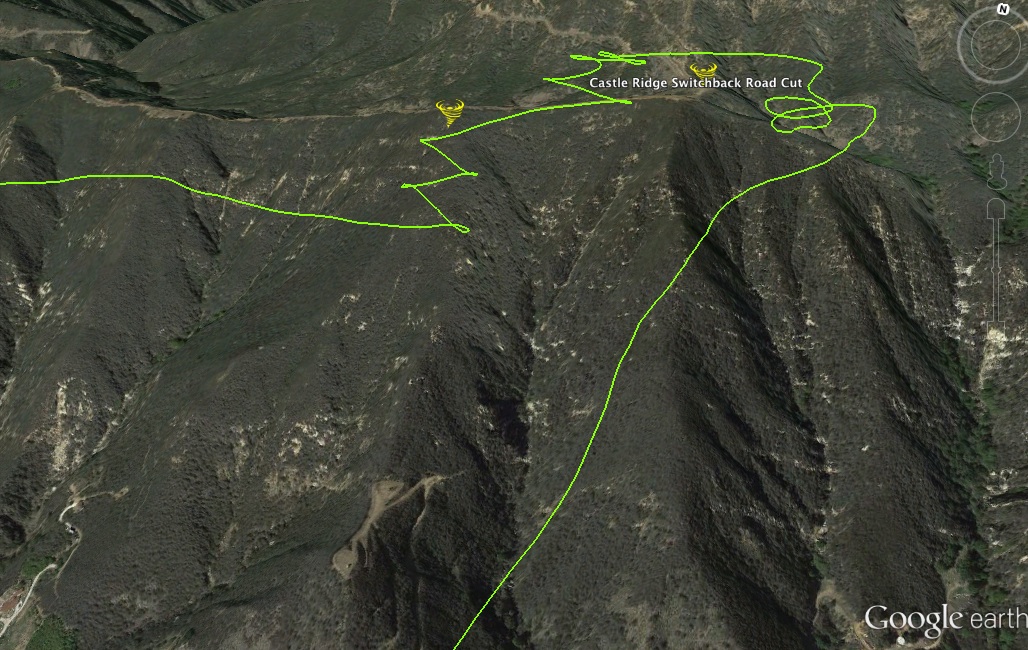 My most interesting and informative stop was at Castle Ridge Switchback ?... where the road goes directly back into the mountain. See from my GPS, that i worked for about 10 minutes stepping back uphill... but after I reached the top of the ridge, I gave it another turn, and decided to take my altitude to a Cali Burger and a coke.