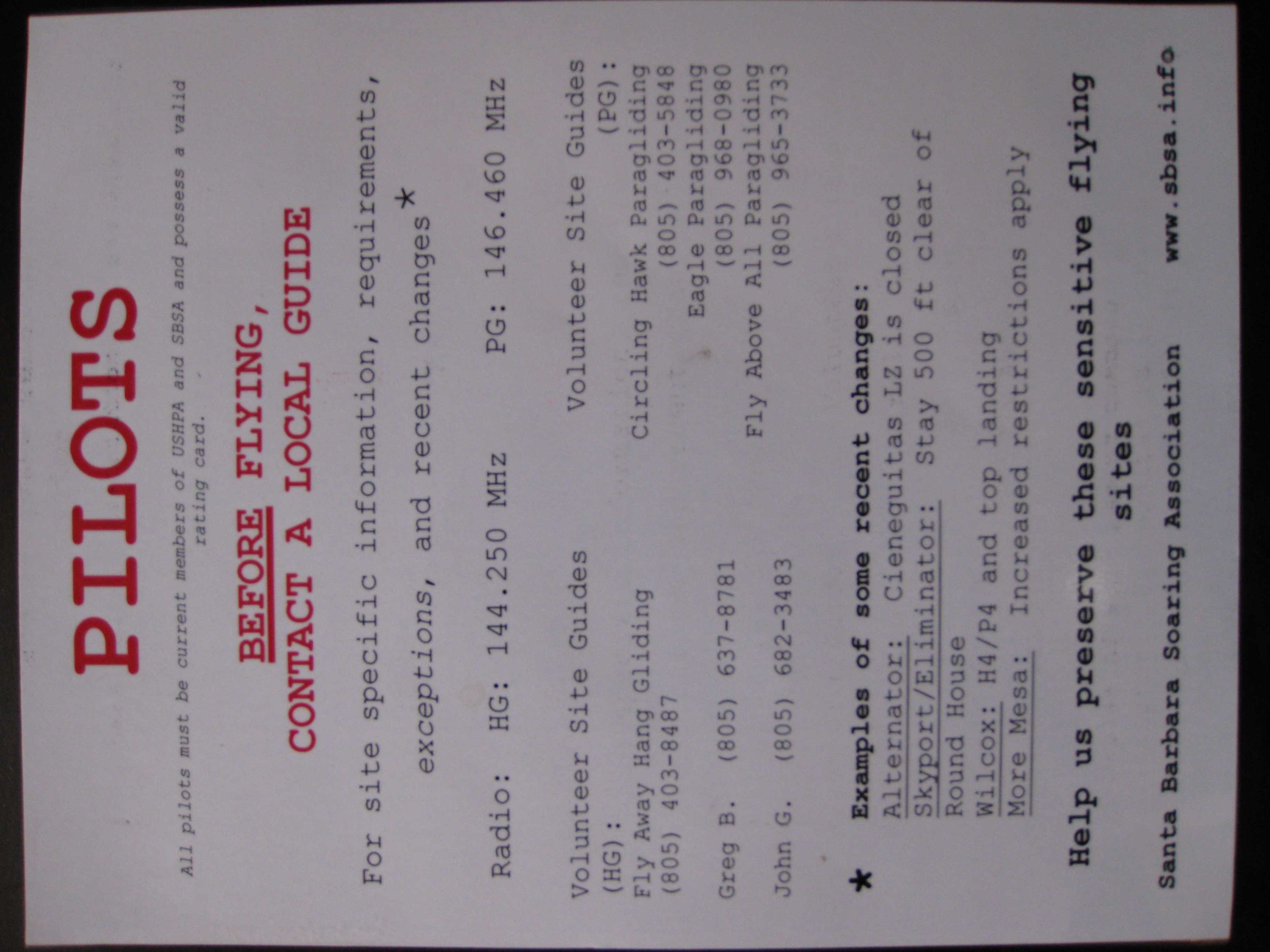 Dean emailed me a few suggestions for the guide sheets. I've added radio frequencies, 146.46 and 144.250. I only have sheets for the sites I was taking new pilots, so don't have anything for Nordhoff, Skyport, or Wilcox. If someone wants to whip up some text and basic guidelines using Alternator as an example of how much we can cram in, and what kind of stuff should be on it, shoot it at me and I'll lay it out. Skyport will have to include round house rules, beach rules, Parma, St. Mary's, Snake Pit, launch rules, a warning about flying down the middle of canyons, and powerline issues. Wilcox needs pilot rating rules, tide issues, tree issues, top-landing issues, tree-clearance issues.