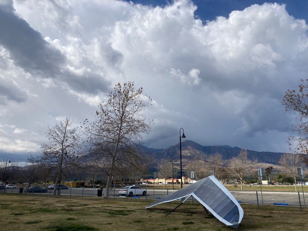 My concern now was how to terminate the flight. I’ve previously been at the Castaic Junction in scary venturi river wind and had trouble getting down. There was some river wind on Friday but manageable. My bigger concern was dark clouds ahead dumping in 3 places. A large dump directly ahead over the Interstate and 2 smaller dumps on either side of the river. I was leery about the potential for gust fronts on the surface. I wanted to get to the interstate but continuing seemed like more hazard than the convenience was worth? My now excess altitude was also starting to become an issue as I still had 3800 (about 2800 AGL) with only 3 downwind miles to go, and I was starting to get hailed on, So… I turned around with the intention of flying westbound away from the dumping precipitation.