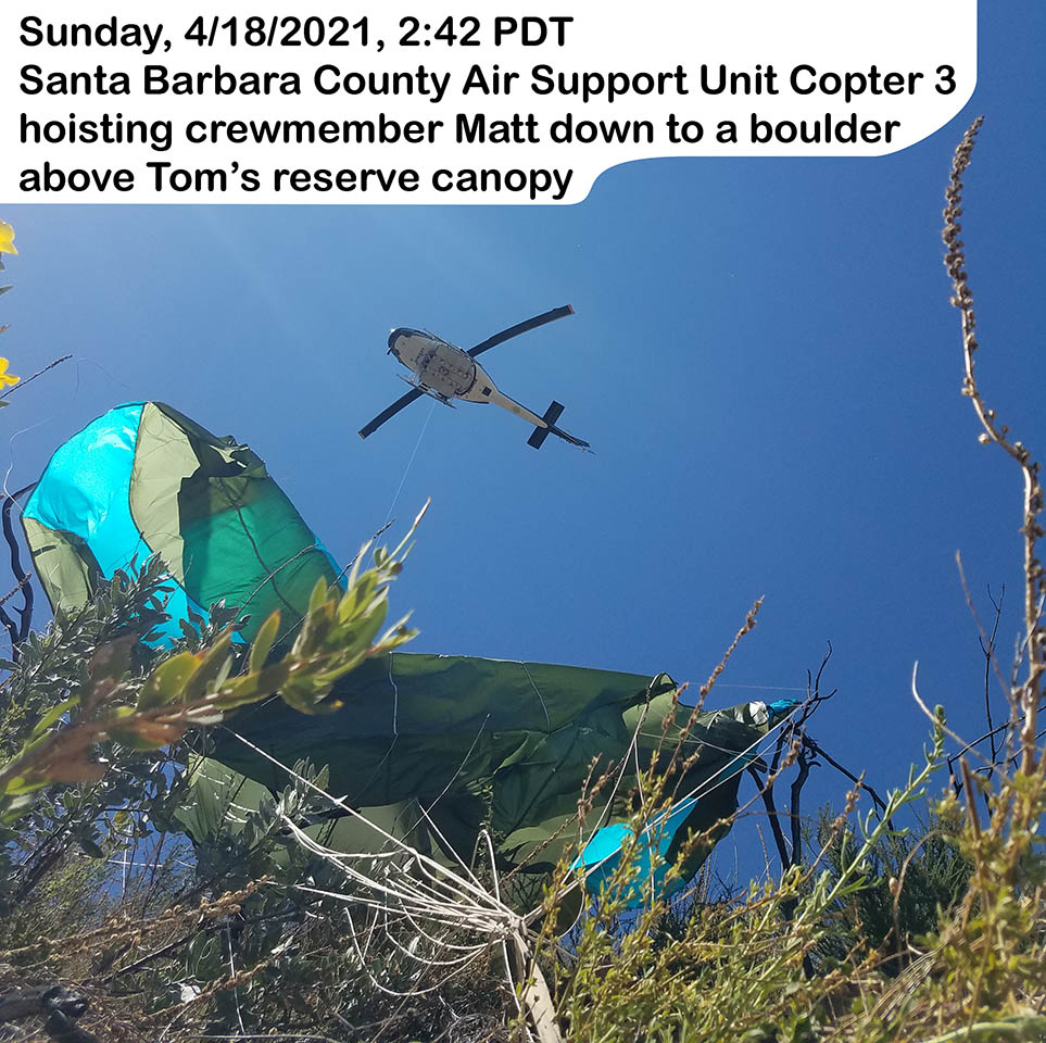 Matt thought we could hoist from our present location, but the downwash was too much, driving the reserve canopy down and over us. We were in jeopardy of getting blown off our perch, so he opted to abort without grabbing the winch line. My foot injury was to the heel. I could walk on my toes and told Matt I could go uphill on all 4s to get above the reserve, so we clawed up 50 feet to the same boulder that Matt initially landed on.