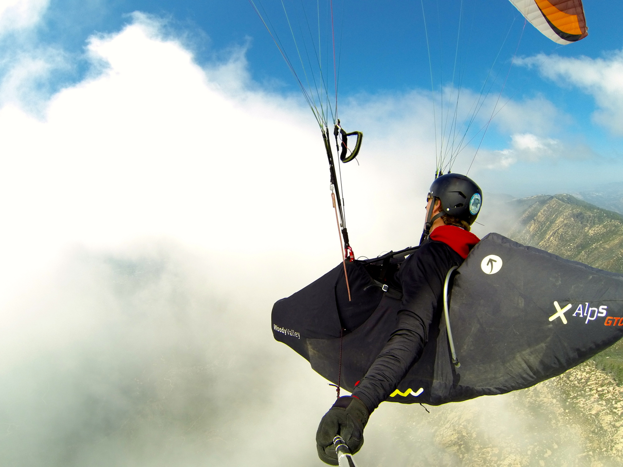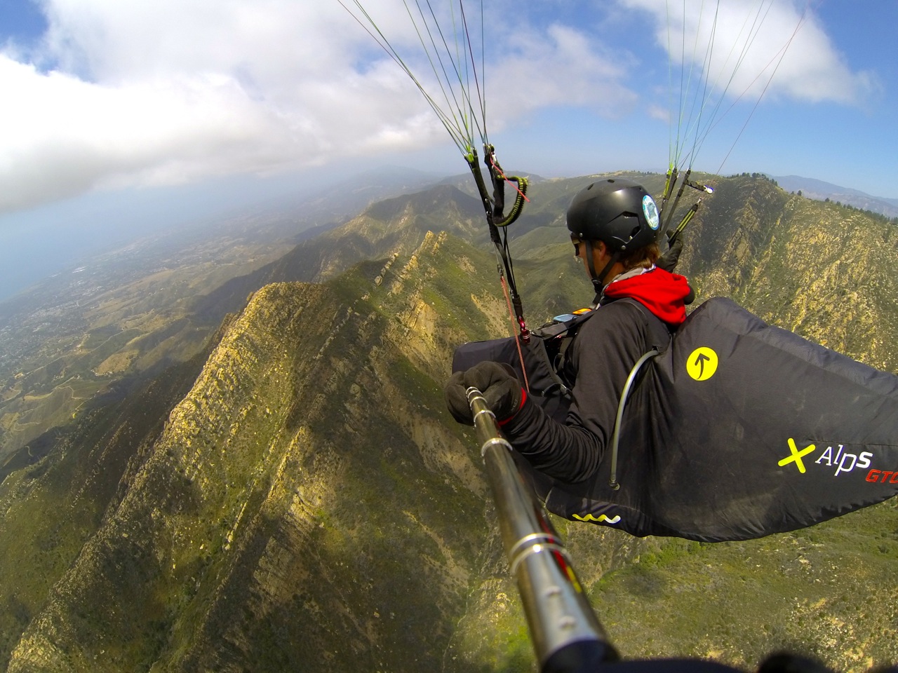 Bob Hurlbett and I arrived at Skyport at 11:30 AM to take advantage of an unusual low pressure day in May in Santa Barbara. There was a low cloudbase out front, but the day obviously had potential. Cycles were decently strong at launch and Marge and Kevin and another pilot were set up to go. The air was mixing a bit and there was a bit of east in it, making for a few unsuccessful attempts when people pulled up. The others got off; I spread out Bob and he had a perfect launch leaving me alone as the last pilot to go. For some reason, I thought I had a line-through on one riser and I did some acrobatics stepping over and through lines trying to get it straightened out without unclipping my risers or getting out of my harness. This only added to my impatience to get off and join the others going downrange in the great conditions of lift everywhere. Padaro Grill, here I come.