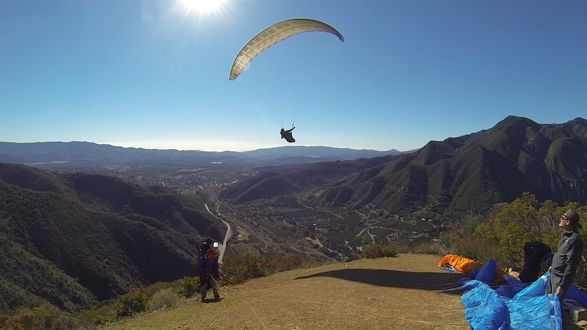 What can I say but a GREAT start to the New Year with 6 of us launching the Nuthouse in Ojai and all making it over the pass to SB (5 landed Elings and Ron landed E Beach). Beautiful hike in the cool weather to launch. It was my first time launching there. It's a smallish but immaculately clean launch site. Handtools are kept up there for continued maintenance and SD got to it as soon as he was on launch. I brought a go pro but unfortunately forgot the mounting clamp so I didn't take much in the way of in air footage. Tim, Aaron and I got stuck low over the peak of Whiteldge for a little bit and I really wish I had the camera going then while the 3 of us circled together closely hoping for a climb that would let us chase down SD on his westbound leg. Got a great climb over 4000' at the RR that made for an easy glide to Elings to join the party. As soon as we can do another flight from Nuthouse westbound I'm in!