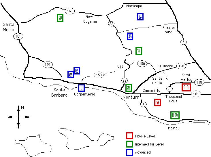 IMPORTANT: Flying at this site requires notification of Pt. Mugu tower, whose airspace is being penetrated. It is required that all pilots call (805) 989-7677 and inform the tower before flying. Though there is no formal rating requirement for flying this site, a minimum of Hang 2 is recommended.